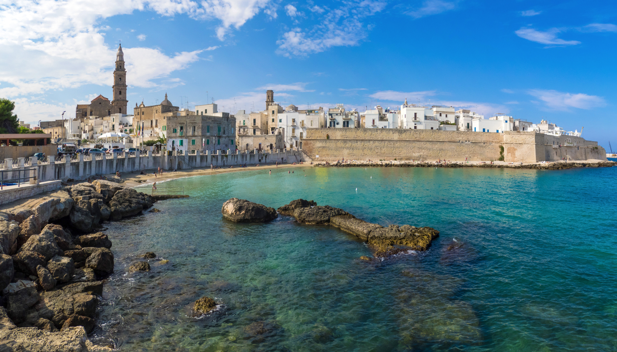 Transfert à Polignano A Mare en train (30min de trajet). Citée fondée par les Grecs, ses maisons blanches accrochées à des falaises battues par les vagues sont très caractéristiques. Depuis son magnifique centre ancien, nous suivons le bord de mer sur un petit sentier surplombant les falaises calcaires jusqu'à la Tour Incisa. Après un court transfert en taxi privé, nous gagnons Monopoli avec son joli centre médiéval et son port de pêche, ouvert sur l'Adriatique. Retour en train à Bari (45min de trajet).