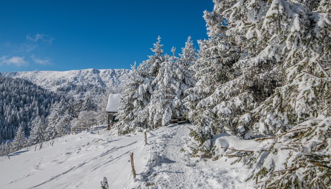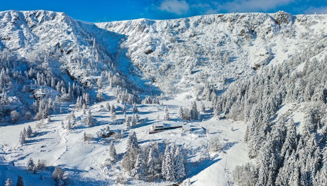 Départ après transfert au col du Calvaire (1144 m) ou au col des Bagenelles (904 m), selon l’enneigement. L’itinéraire suit les crêtes et mène vers le Gazon du Faing (1302 m) ou le Petit Brézouard (1202 m). Le midi, halte dans une auberge traditionnelle, installée en altitude, juste en contrebas de la crête. Nous y retrouvons une salle chaleureuse et une table généreuse qui fait du bien après la marche. L’après-midi, la randonnée se poursuit en balcon, avec de belles vues sur les lacs et les reliefs vosgiens.