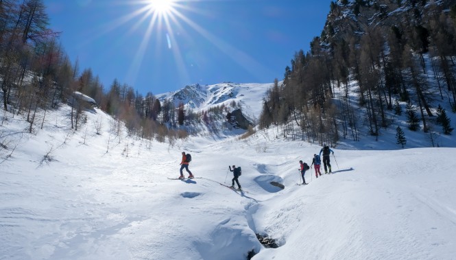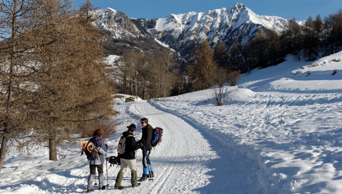 Le démarrage est doux avec un parcours presque plat le long d’un magnifique torrent gelé. Nous quittons ensuite la vallée, pénétrant ainsi au cœur de la réserve. L’observation de chamois, parfois de bouquetins, souvent même d’assez près, est à peu près certaine! Ce moment privilégié avec la faune sauvage donne l’occasion à notre accompagnateur de nous parler des mœurs des grands ongulés de montagne. Peu après les chamois, nous rejoignons les chalets de la Médille, superbe belvédère qui nous offre une vue exceptionnelle sur le Viso.