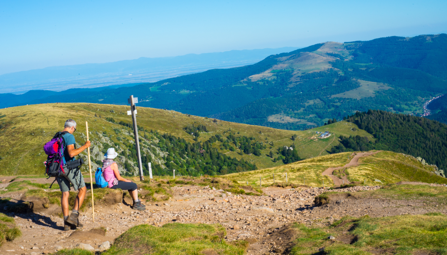 Le massif des Vosges, relief emblématique de l’Est, s’élève progressivement d’ouest en est jusqu’à la célèbre crête des Vosges culminant à près de 1400m d’altitude. À l’est, les vallées alsaciennes plongent vers la plaine du Rhin, offrant des panoramas spectaculaires. Cette ligne de crête, ponctuée de nombreux sommets, dévoile des vues à 360° sur les paysages vosgiens, entre forêts profondes et horizons dégagés. En contrebas, de magnifiques lacs glaciaires se nichent au cœur de cirques forestiers et rocheux. Ces sites naturels préservés constituent des étapes incontournables lors d’un séjour de randonnée dans les Vosges, particulièrement appréciées en été pour leur fraîcheur. Ce séjour permet de découvrir toute la richesse des paysages vosgiens : forêts de conifères, hêtraies d’altitude aux troncs sculptés, et hautes chaumes, vastes prairies d’altitude aux teintes dorées. Les itinéraires de randonnée pédestre dans les Vosges alternent entre sentiers forestiers, crêtes panoramiques et espaces ouverts, offrant une immersion complète en pleine nature. Après chaque journée de marche, l’accès à un espace bien-être permet de prolonger l’expérience en douceur, idéal pour se détendre après la randonnée.