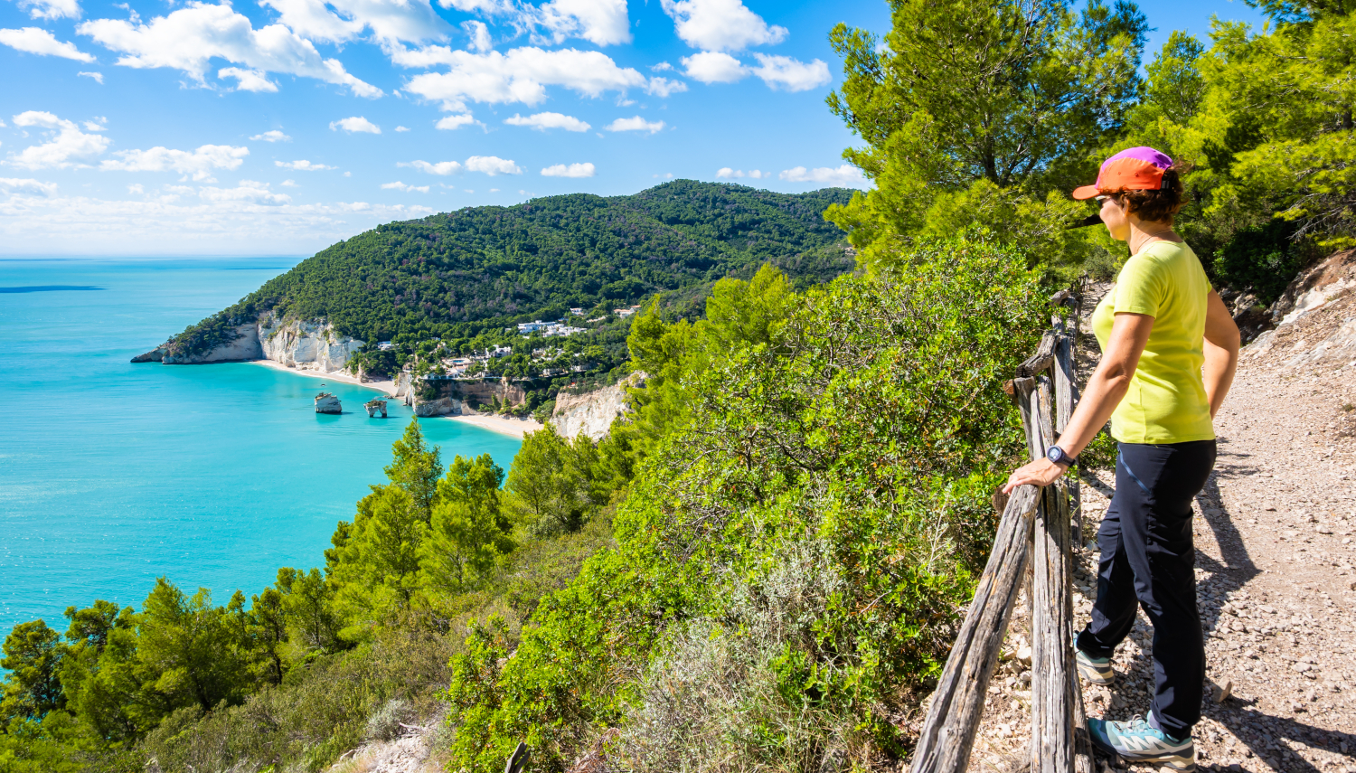 Randonnée en surplomb de la mer par la nécropole préhistorique du Monte Saraceno et par la plage de Mattinata. Baignade possible.