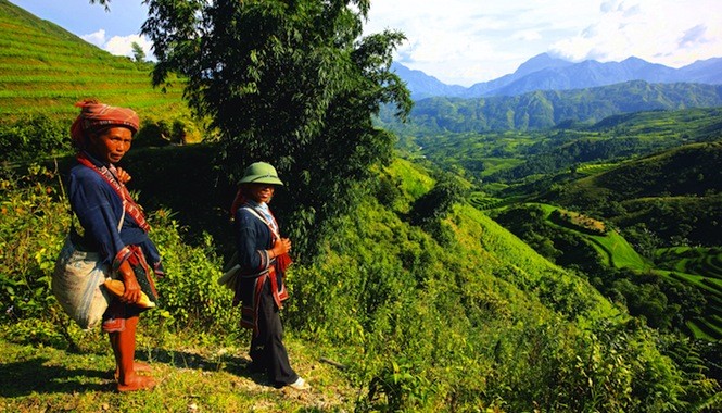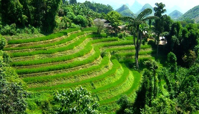 Trek. Découverte de la vallée de Nam Son en Territoire Kim Mun. Les vallons remodelés par des générations de paysans, en terrasses, alternent avec une végétation tropicale luxuriante. Nuit chez l'habitant.